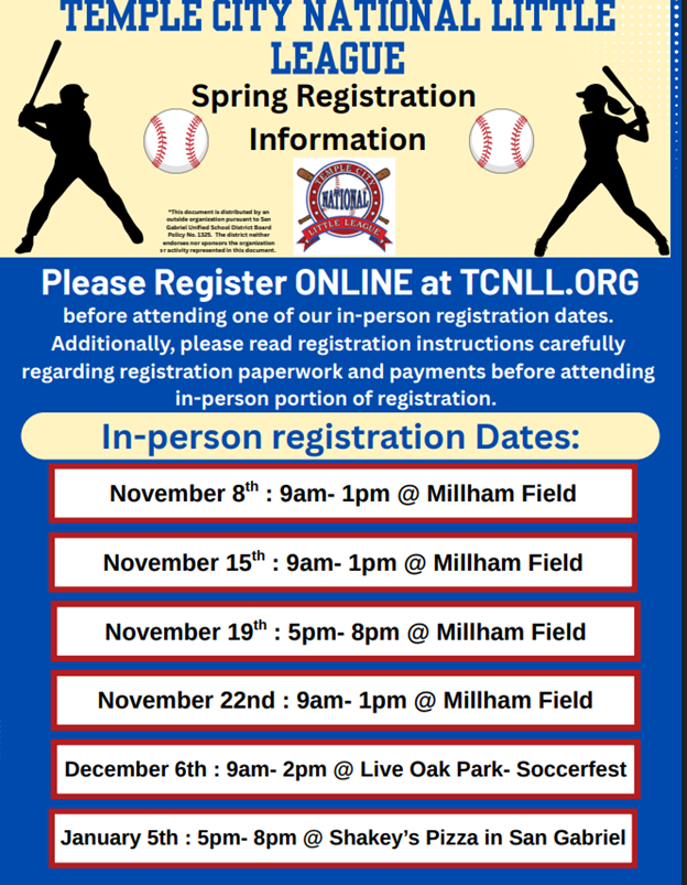 TEMPLE CITY NATIONAL LITTLE LEAGUE's Spring Registration Information meetings announced!